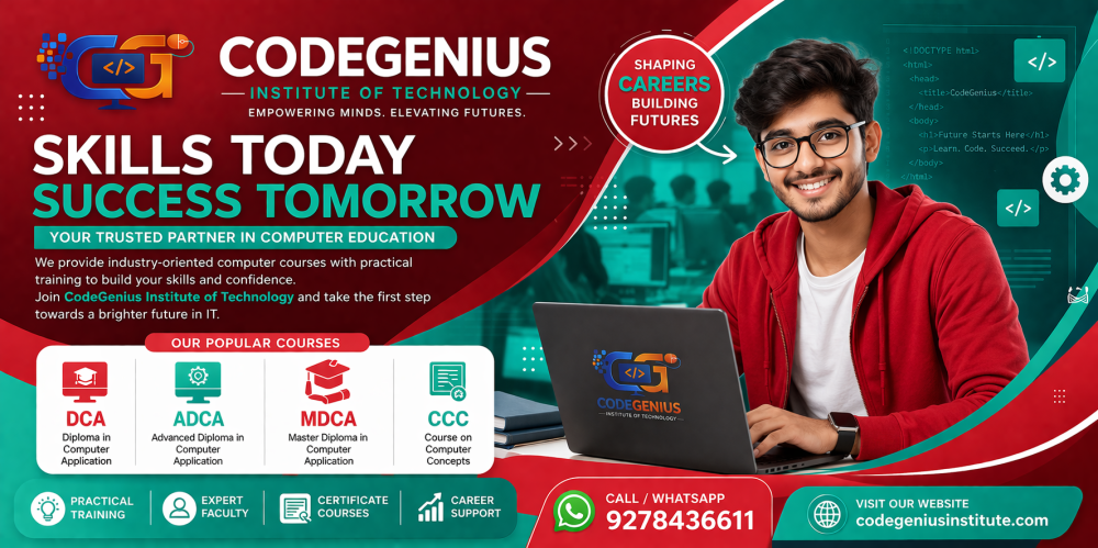 - CODEGENIUS INSTITUTE is educational website, stands as a beacon for skill development in the heart of AZAMGARH, UTTAR PRADESH. Our courses are carefully curated to equip individuals with the tools they need to thrive in the dynamic landscape of modern industries. Courses Offered: ADCA (Advanced Diploma in Computer Applications): Master the intricacies of computer applications to stay ahead in the tech-driven world. DCA (Diploma in Computer Applications): Build a solid foundation in computer applications for a diverse range of career opportunities. Typing and Stenography: Sharpen your typing skills and delve into the art of stenography for a competitive edge in administrative roles. Website Development: Unlock the secrets of web development and design to...